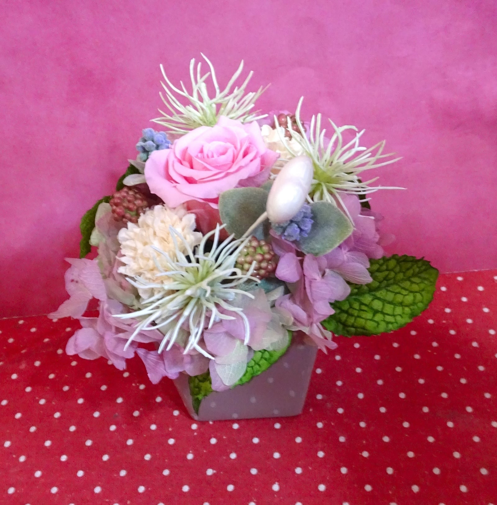 プリザーブドフラワーアレンジはお水なしで数年綺麗に飾って頂けますので贈り物に最適ですよ♪(^_-)-☆