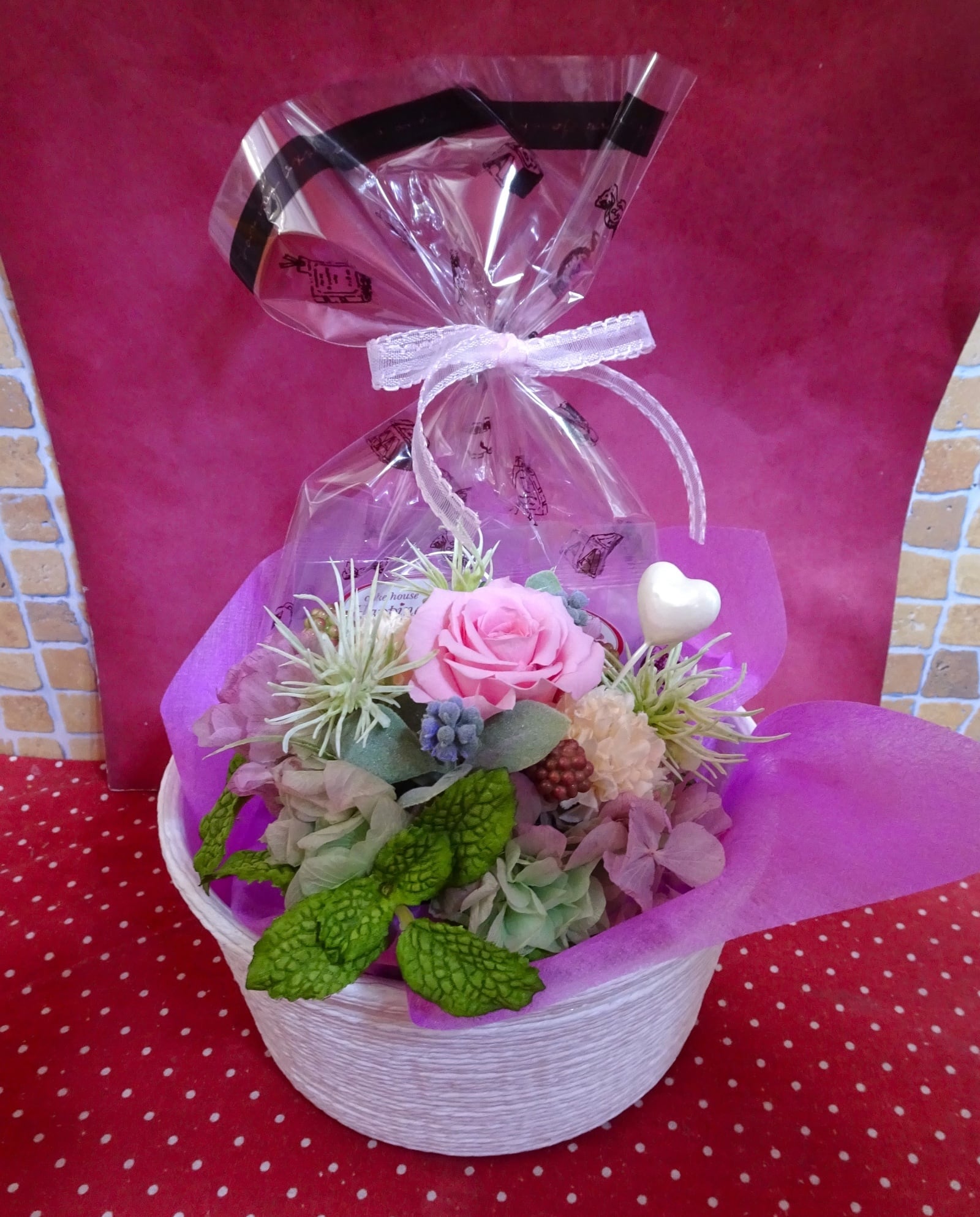 スクエア型陶器にピンクの薔薇のプリザーブドフラワーとハート系の焼き菓子2袋のギフトセット♪(*^▽^*)