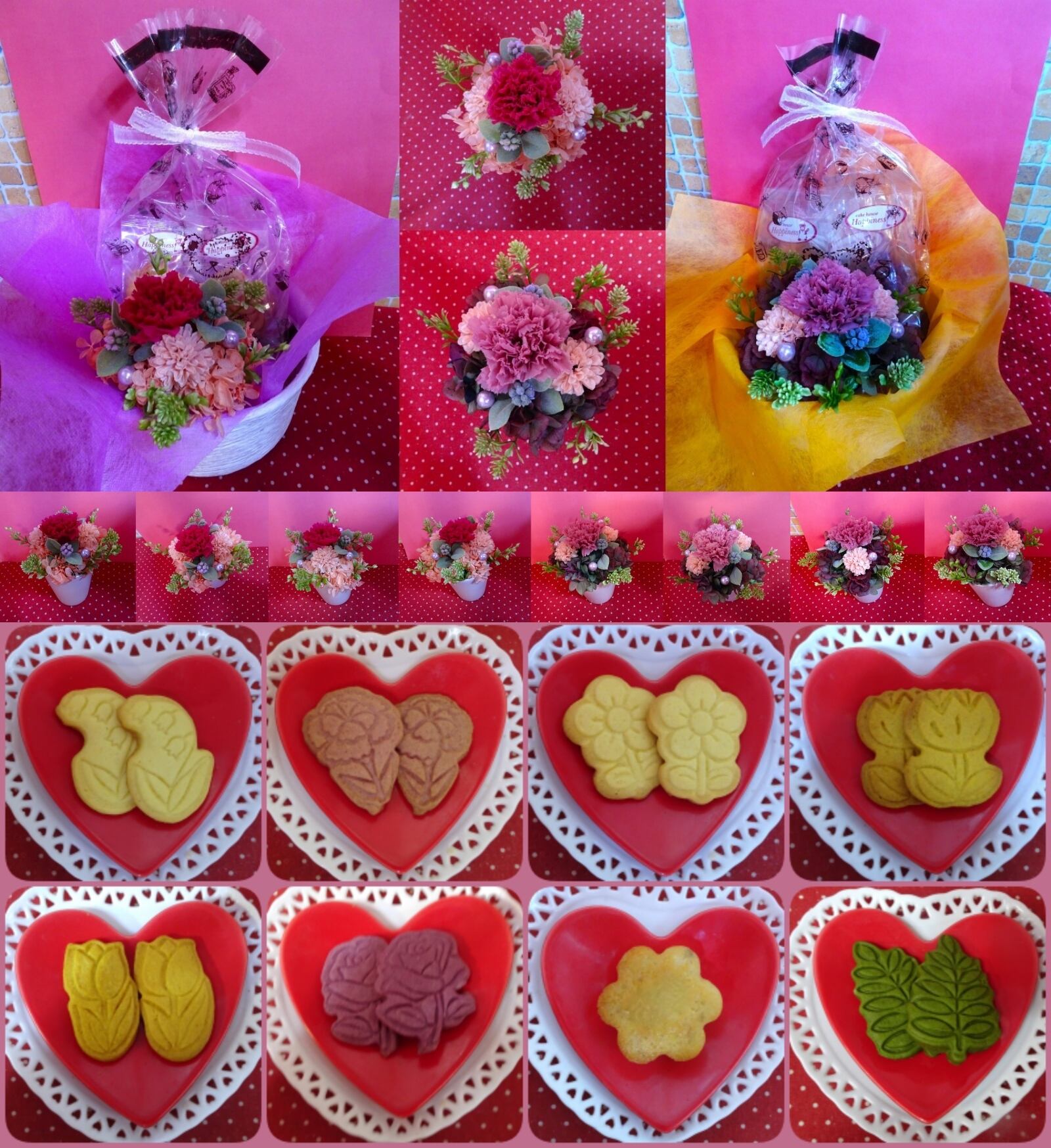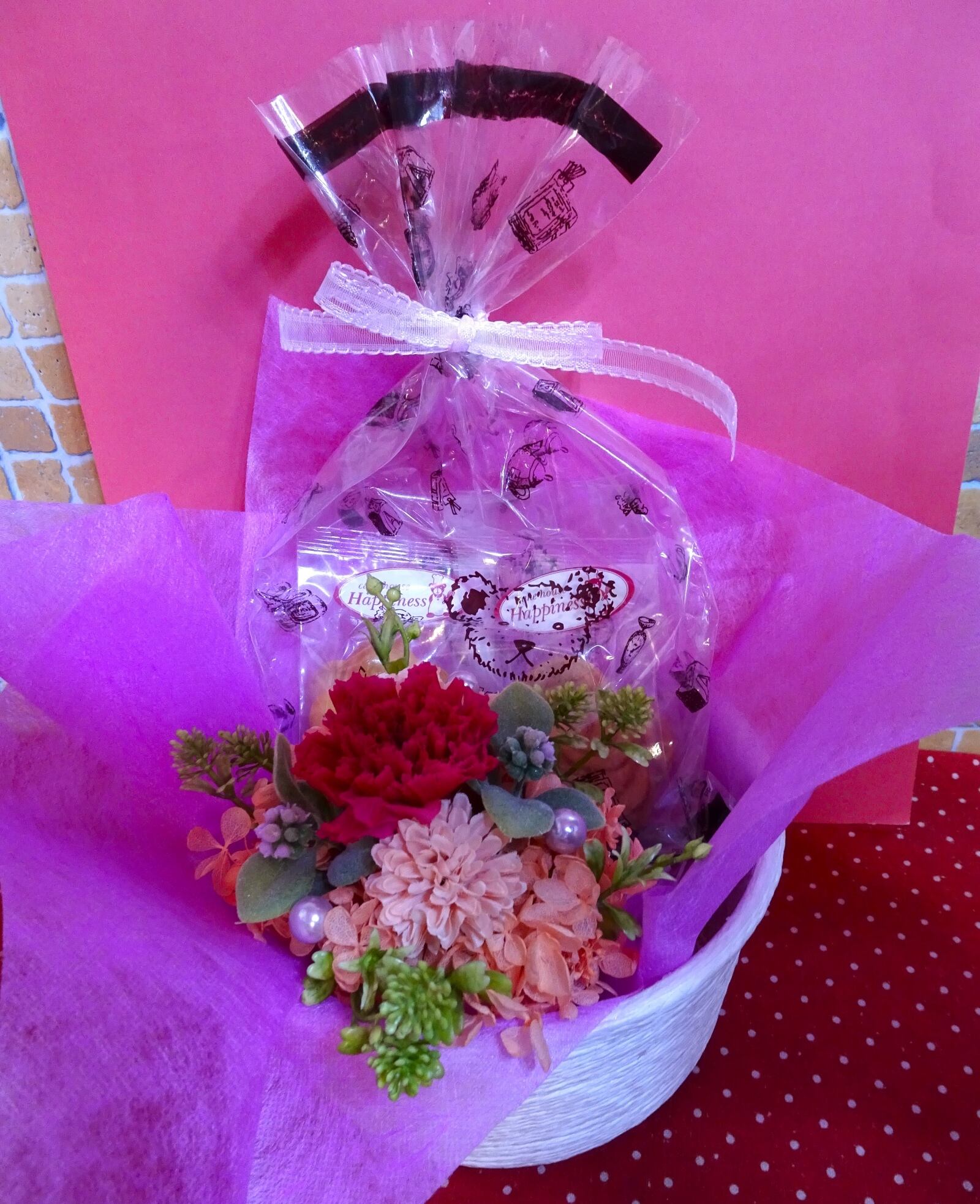 赤いカーネーションのプリザーブドフラワーアレンジとお花の形の焼き菓子2袋のギフトセット♪(*^▽^*)